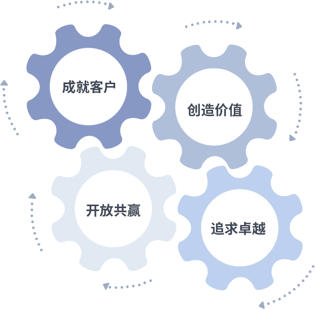 成就客户是一切决策的出发点,,创造价值是衡量所有工作的标准,,,,追求卓越是我们做事做人的态度,,,,开放共赢是我们的格局也是最终的结果。。价值观的齿轮环环相扣,,推动着组织里的每个人不断向前。。。。