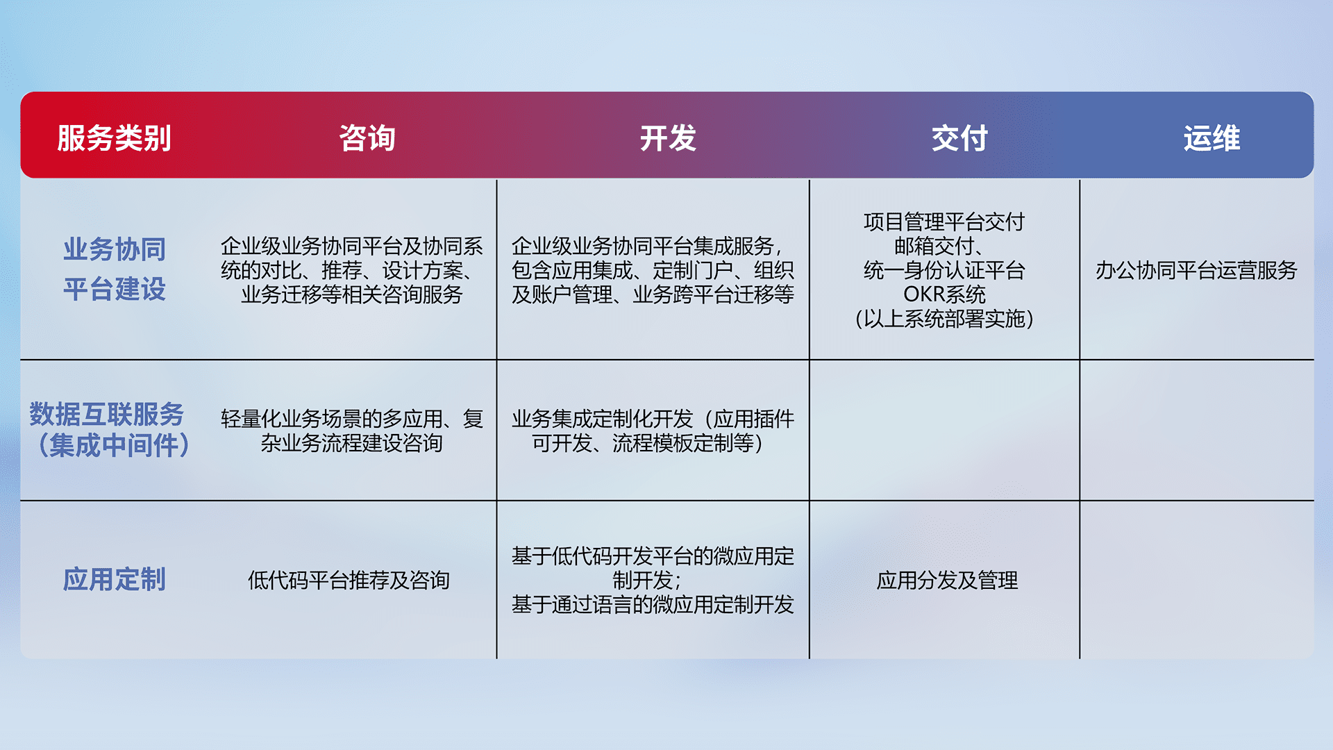 针对钉钉、、、、企微、、、、IDaas等平台级产品提供产品的规划、、、、方案、、、交付、、定制化开发等服务,,实现如统一协同办公、、、智能客户服务、、混合会议管理、、、智能数据查询、、、、等业务场景,,,实现数字化转型。。。